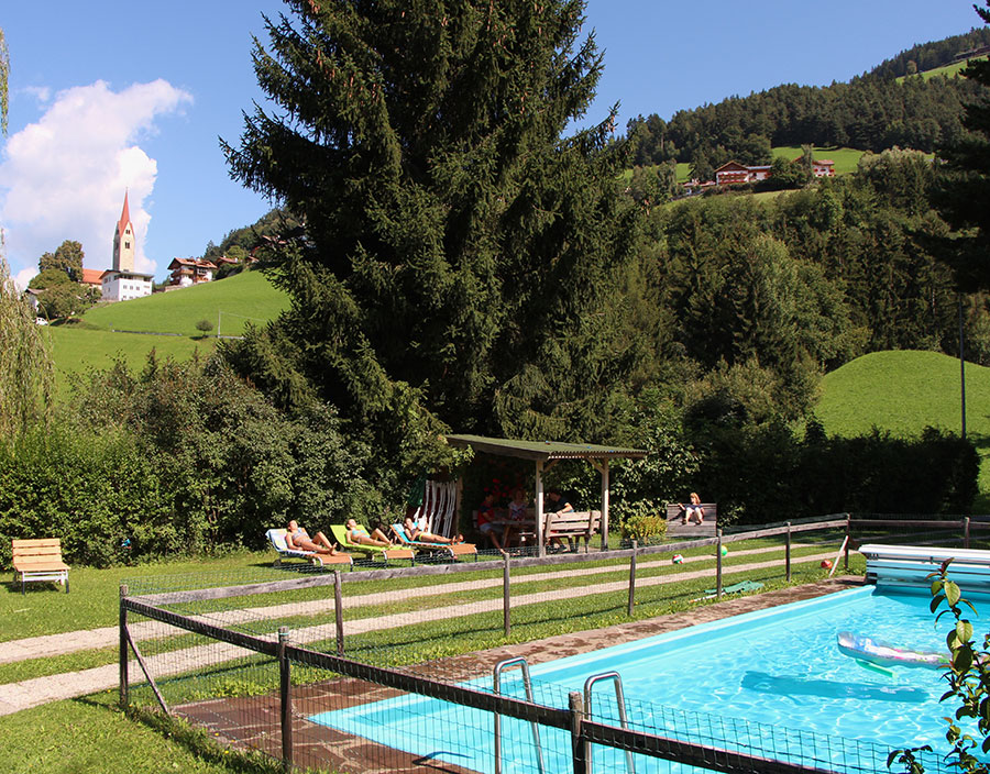 Godetevi la nostra piscina riscaldata immersa nella natura, con una spettacolare vista sul paesino di San Leonardo e sulle vette intorno.